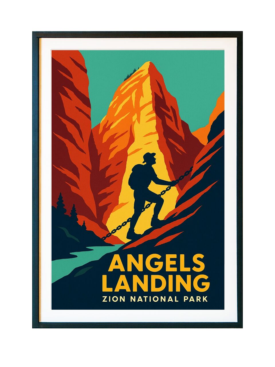 The artwork captures Zion’s most legendary trail at its most iconic moment — towering sandstone walls glowing in warm desert light, a narrow ridge rising skyward, and the unmistakable silhouette of a hiker gripping the famous chain route. Rendered in bold, retro travel-poster style, the composition reflects both the thrill and reverence of standing high above Zion National Park’s canyon floor.