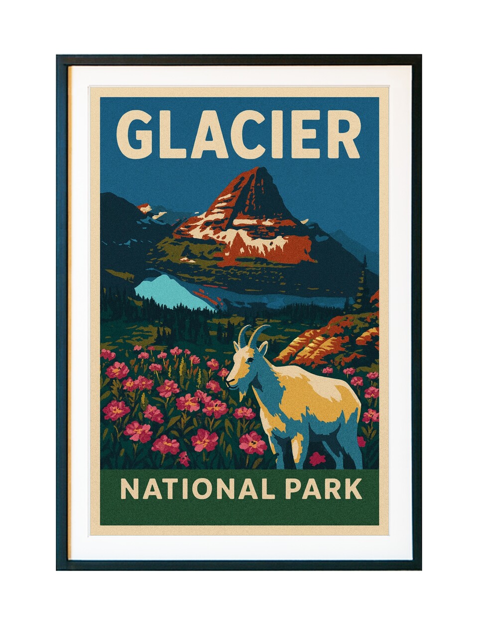 The artwork features a confident mountain goat standing above the turquoise waters of Saint Mary Lake, framed by rugged peaks, evergreen forest, and warm sunrise tones. Illustrated in a classic national-park poster style, the composition captures the calm strength and timeless beauty that define Glacier National Park.