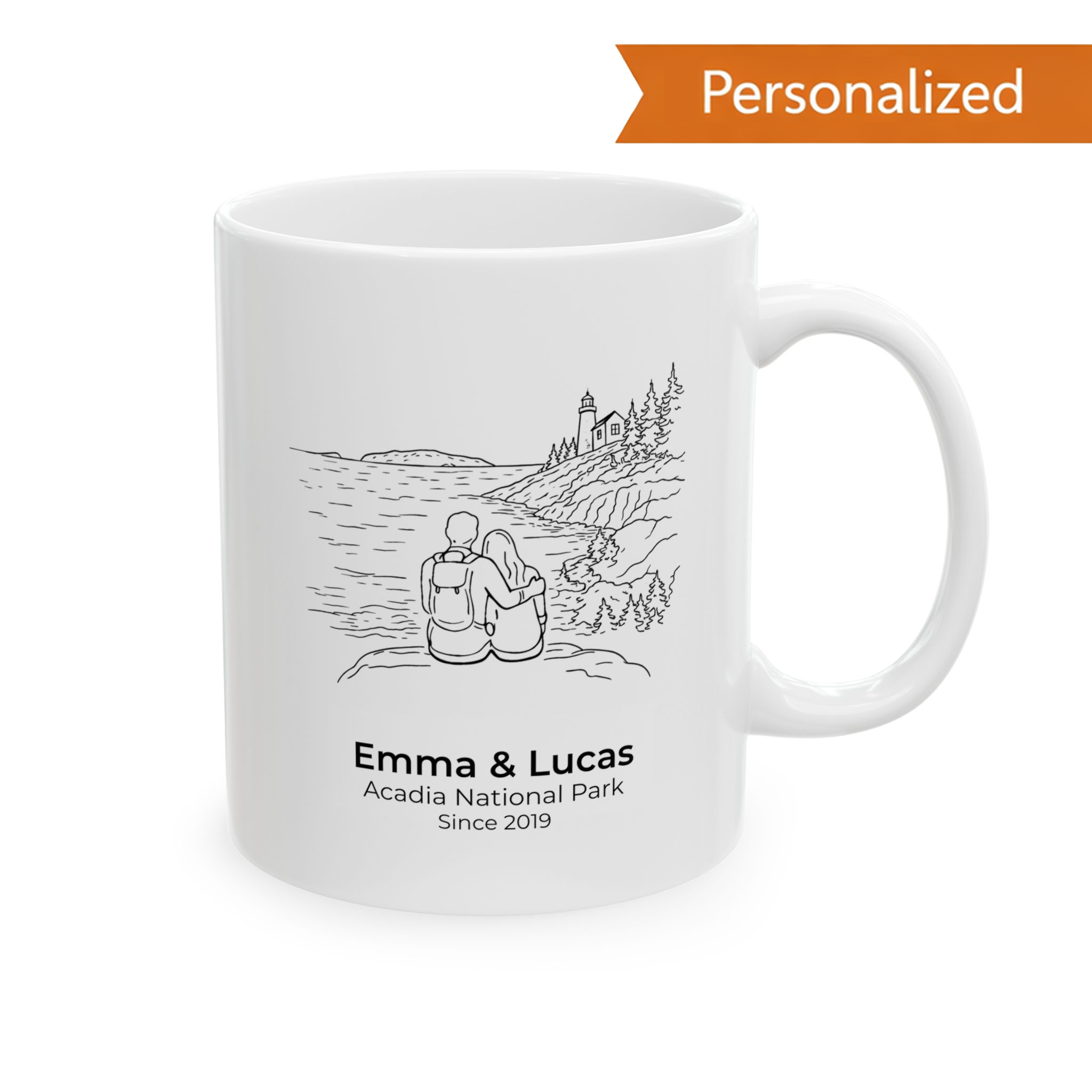 Bring the calm, salt-air beauty of the Maine coastline into your daily routine with this Personalized Acadia National Park Couple Mug, inspired by Acadia National Park. The minimalist line-art illustration shows a couple seated together overlooking rocky shores, evergreen forests, and open Atlantic water — a quiet moment that reflects love, connection, and shared adventure by the sea.