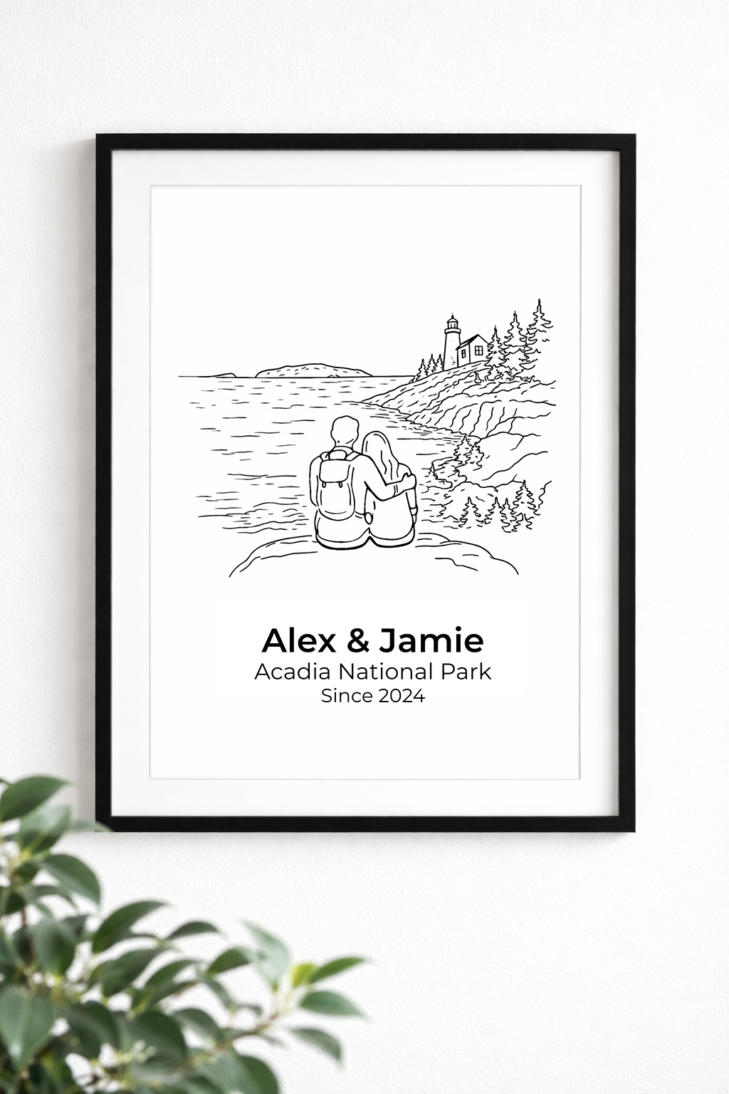 Bring a peaceful coastal moment into your home with this Personalized Acadia National Park Couple Print, inspired by the rugged shoreline and quiet beauty of Acadia National Park. The minimalist black-and-white line art illustration shows a couple seated together, gazing across rocky coastlines, pine trees, and calm Atlantic water — a simple, intimate scene that reflects love, adventure, and shared journeys by the sea.