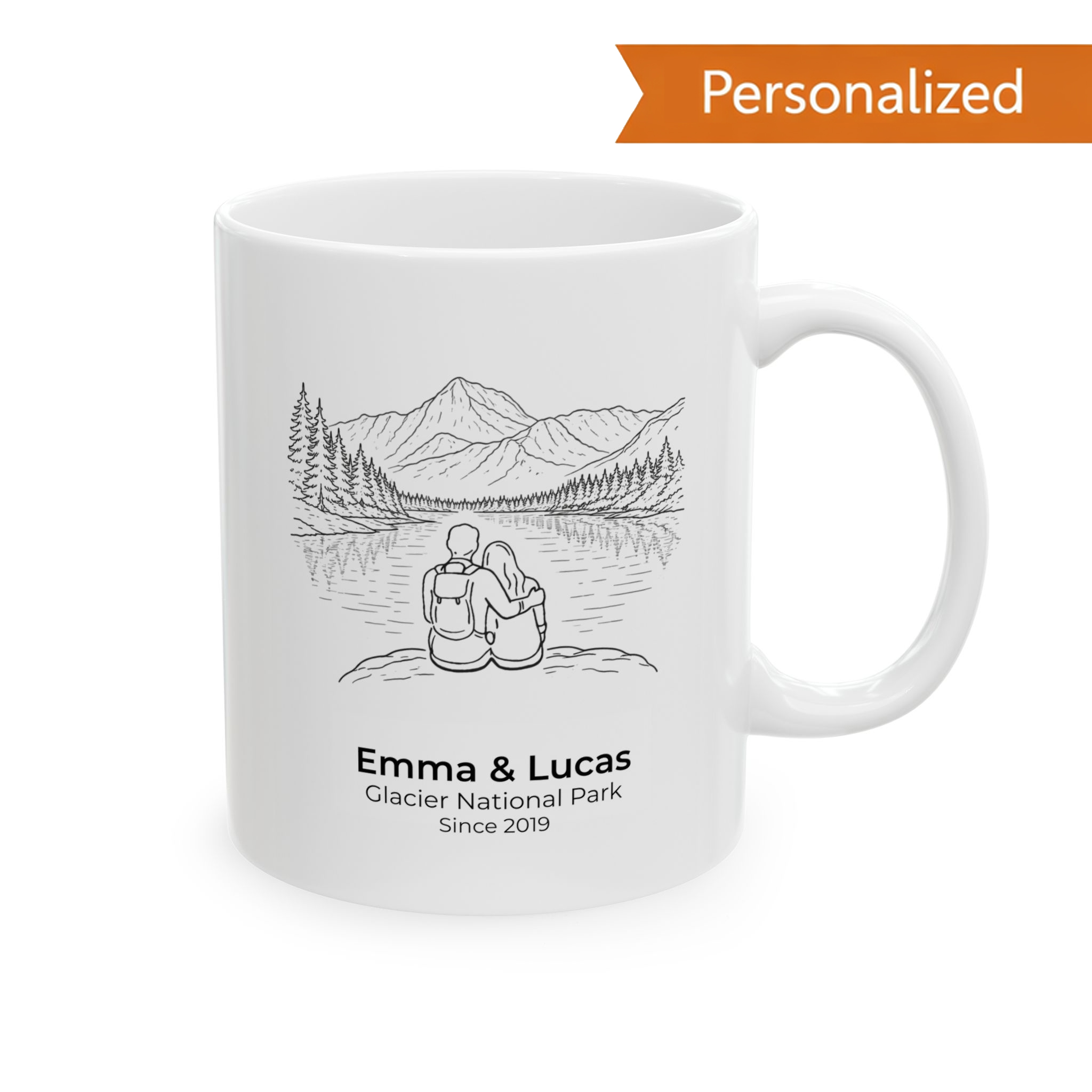 Personalize the mug with two names and a meaningful year or date, creating a thoughtful keepsake for Valentine’s Day, anniversaries, weddings, engagements, or couples who love national parks and mountain landscapes. The clean illustration wraps gently around the glossy white ceramic, leaving space to breathe while hinting at still water, quiet forests, and open skies.