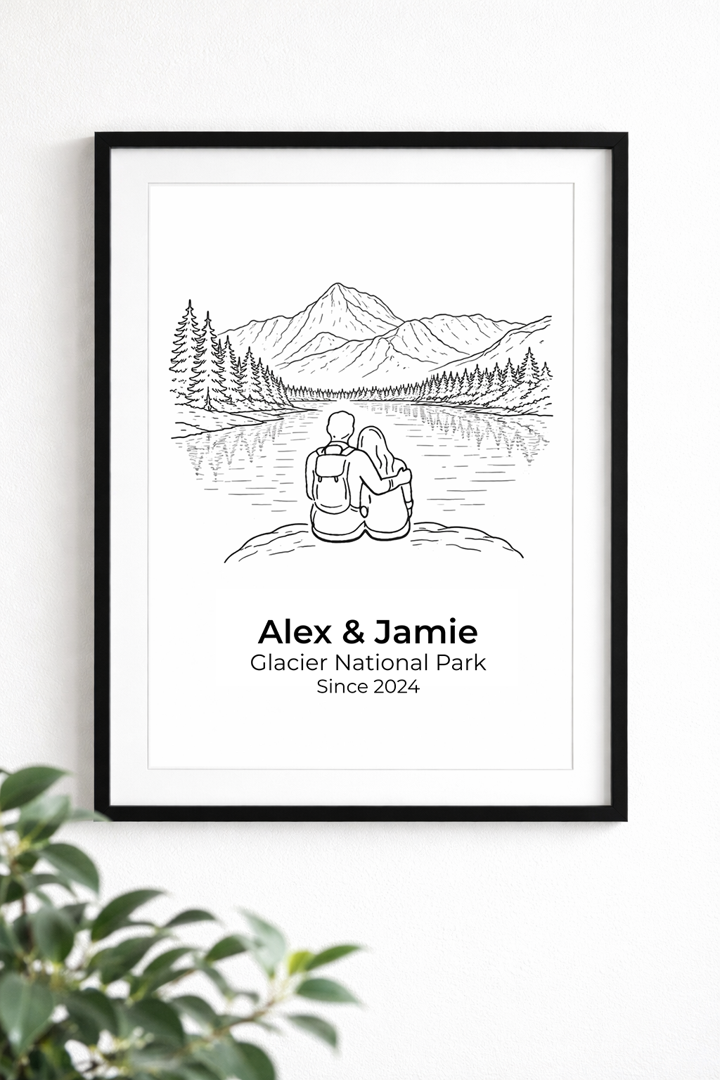 Bring the peaceful beauty of the mountains into your home with this Personalized Glacier National Park Couple Print, inspired by the quiet alpine landscapes of Glacier National Park. The minimalist black-and-white line art illustration shows a couple seated together beside a calm alpine lake, gazing toward towering peaks and evergreen forests — a timeless scene that reflects love, adventure, and shared memories in nature.