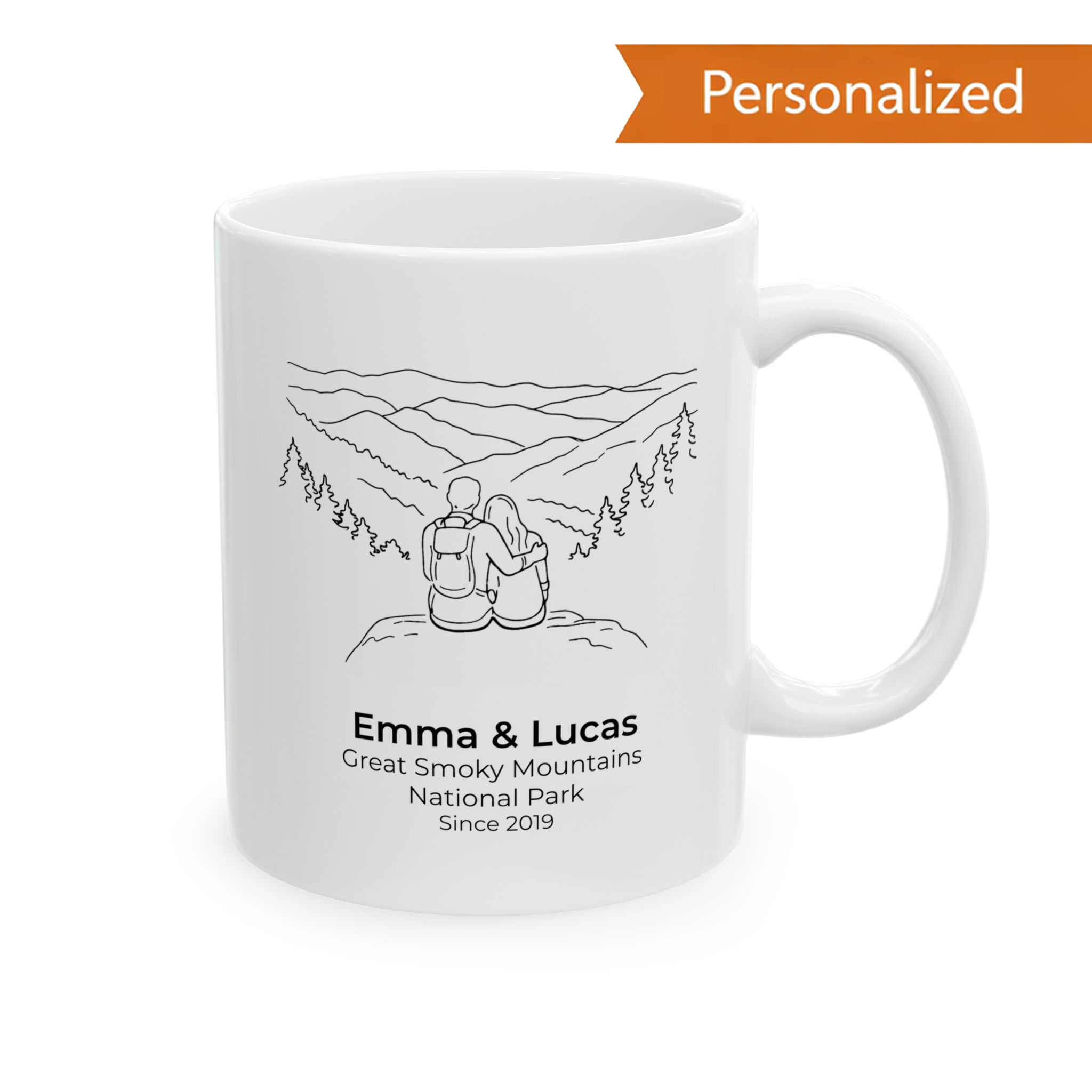 Bring the soft, misty beauty of the Appalachians into your daily routine with this Personalized Great Smoky Mountains Couple Mug. Inspired by Great Smoky Mountains National Park, the minimalist line-art illustration features a couple seated together at a scenic overlook, gazing across layered mountain ridges and hazy horizons — a quiet moment that reflects love, reflection, and shared adventure.