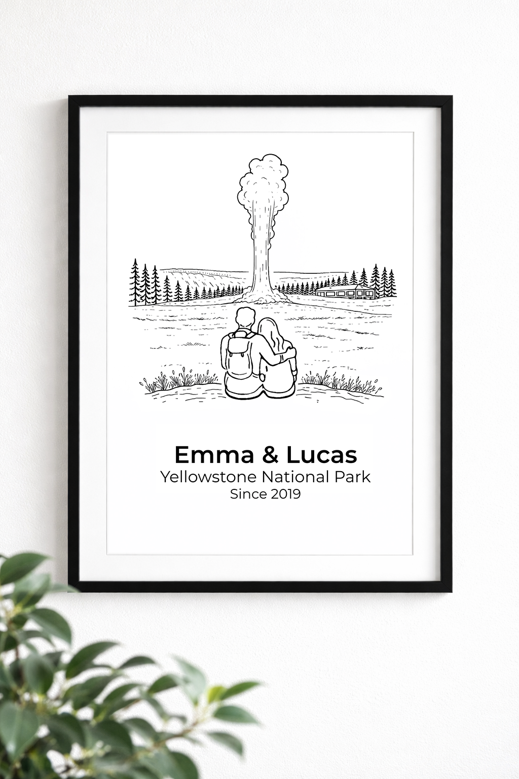 Celebrate a shared adventure with this Personalized Yellowstone National Park Old Faithful Couple Print, inspired by the unforgettable beauty of Yellowstone National Park and its most iconic landmark, Old Faithful.
